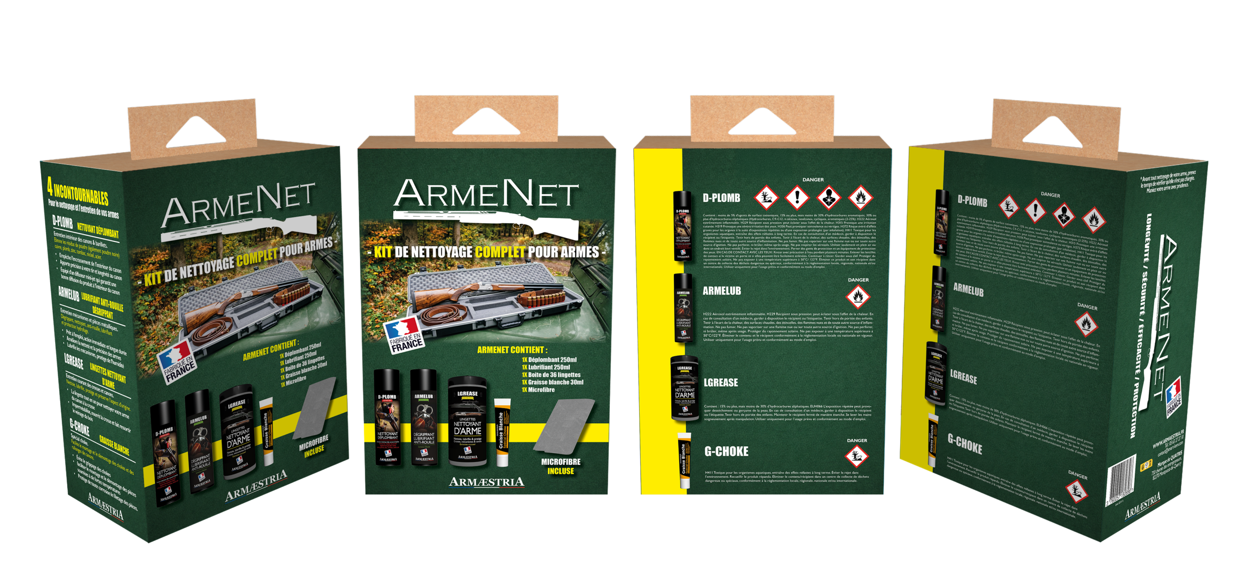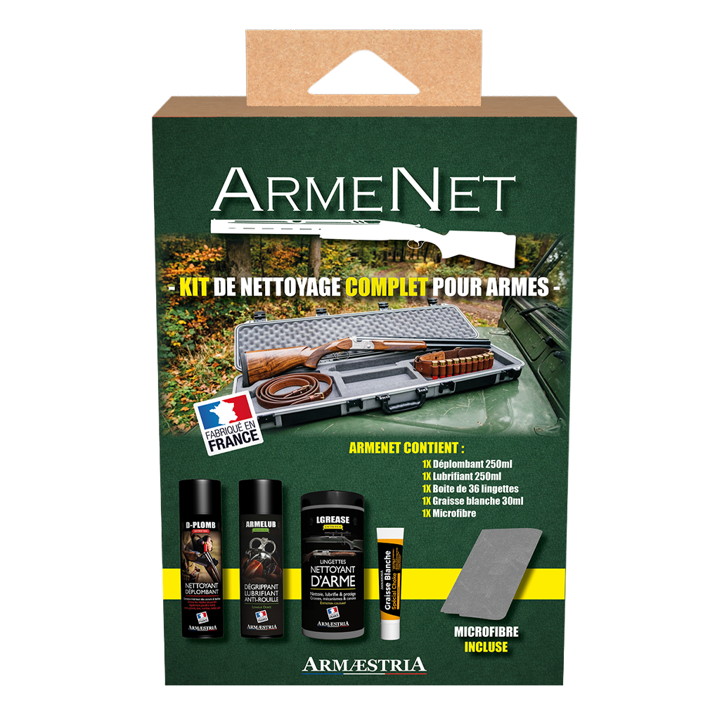 ARMENET est un kit de nettoyage complet qui réunit 4 indispensables de la gamme ARMAESTRIA 1 Déplombant + 1 Lubrifiant + 1 Boite de lingettes nettoyant d’arme + 1 Graisse blanche + 1 microfibre